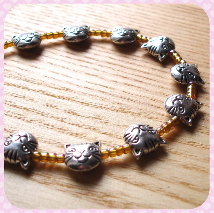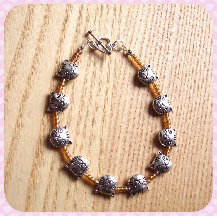 This gorgeous bracelet features some cute cat tibetan silver beads punctuated with teeny glass seed beads. The beads are strung using tiger tail nylon coated wire, finished off with a tibetan silver heart toggle clasp.