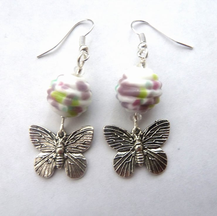 A pair of silver plated earrings which have been made with handmade lampwork glass beads and silver butterfly charms.
