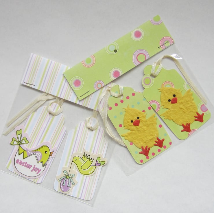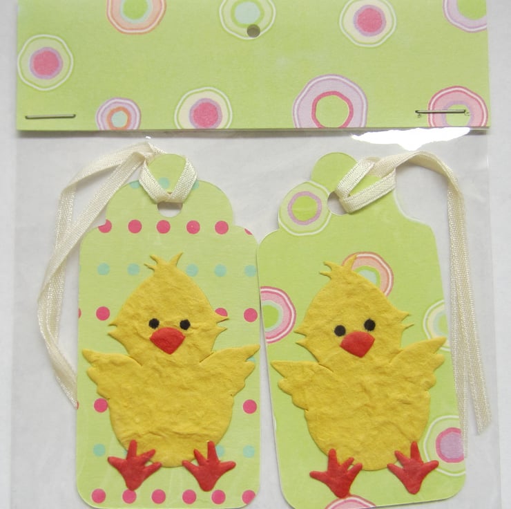 2 packs of Easter chick gift labels supplied in a cellophane bag. 2 tags in each pack. Each tag is plain on the back with cream ribbon. Tags measure 45 x 87 mm.