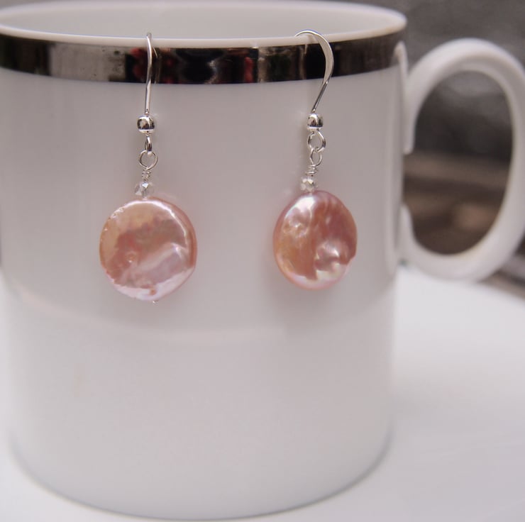 Simple, elegant, classic earrings of very pale pink freshwater coin-shaped pearls, set off with a tiny Czech crystal and suspended from sterling silver ear wires. The pearls are just over 1cm across, and hang approximately 3cm below the ear piercing.