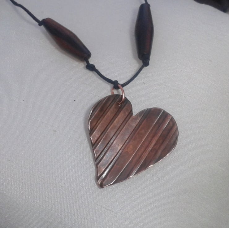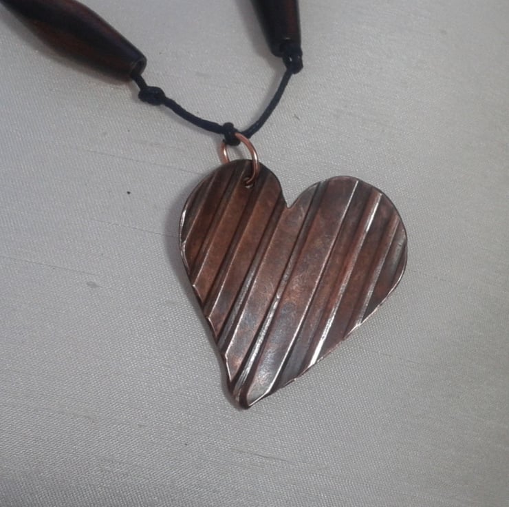 This striking pendant makes an original Valentine's gift, or buy it for yourself just for fun! It is made from 1mm copper sheet which was textured using a rolling mill before cutting out the heart shape with a piercing saw. The shiny copper was then treated with an oxidising agent to give it a darker vintage-style patina. It is attached by means of a copper jump ring to a black cord and complemented by two long wooden beads in natural dark brown mahogany. The copper heart is 4.2cm long and 3.7cm wide; it weighs about 8g. The length of the cord is about 50cm or 21 inches. It can be shortened if you prefer. The cord is fastened with an ornate copper toggle and bar.
