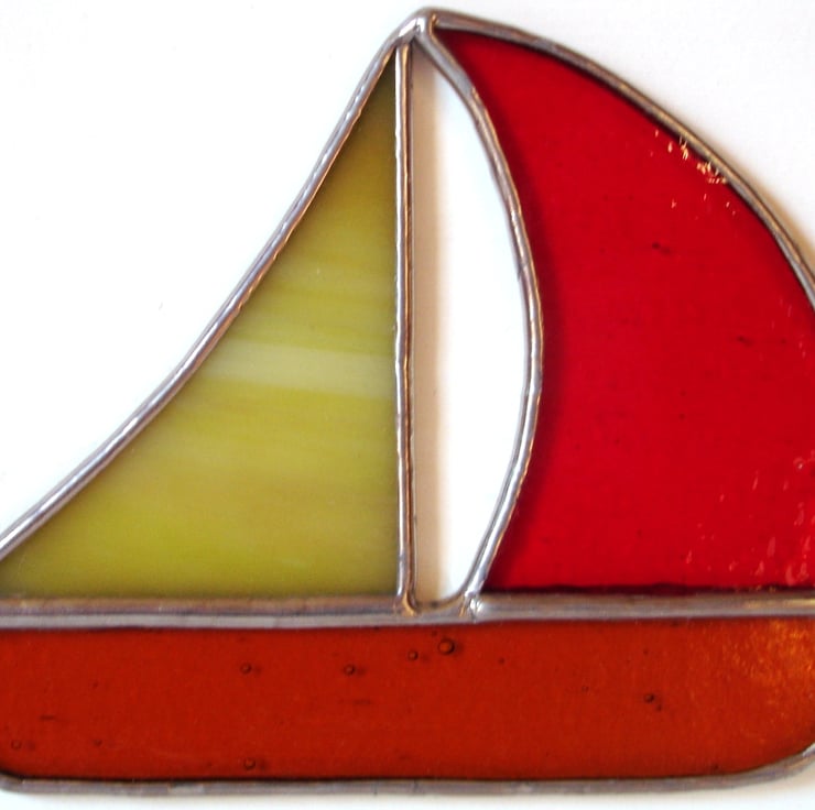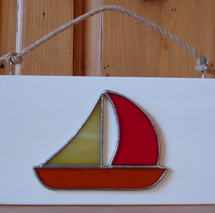 A new design from Stained Glass Art Designs featuring a sailing boat in red, amber and green, set on a hand painted white block. The plaque has a 4mm hemp rope loop and is ready to hang on the wall. A great reminder of that seaside holiday, the boat is hand-crafted using the Tiffany method of stained glass making. Each piece of glass is individually cut and shaped, the edges of the glass are wrapped in copper foil and then the pieces are soldered together.