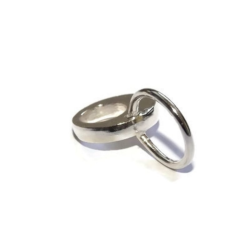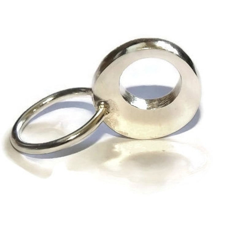 A modern sterling silver ring featuring a round hollow form ring, handmade from sheet silver and featuring a smaller round gap.