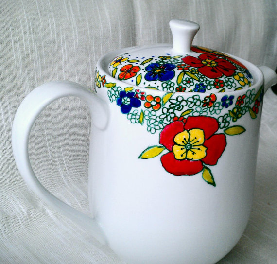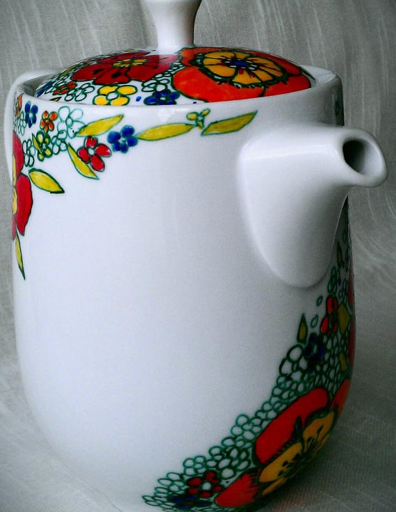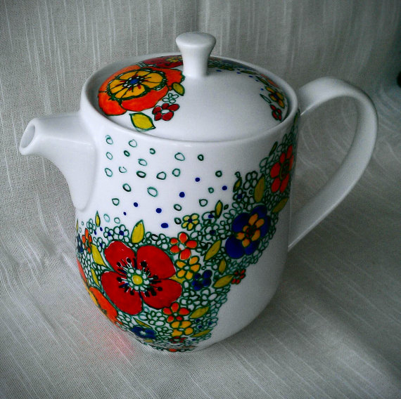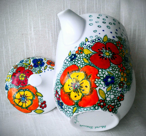 his is a beautifully hand decorated porcelain teapot. The illustration features bold and delicate hand illustrated summer flowers .