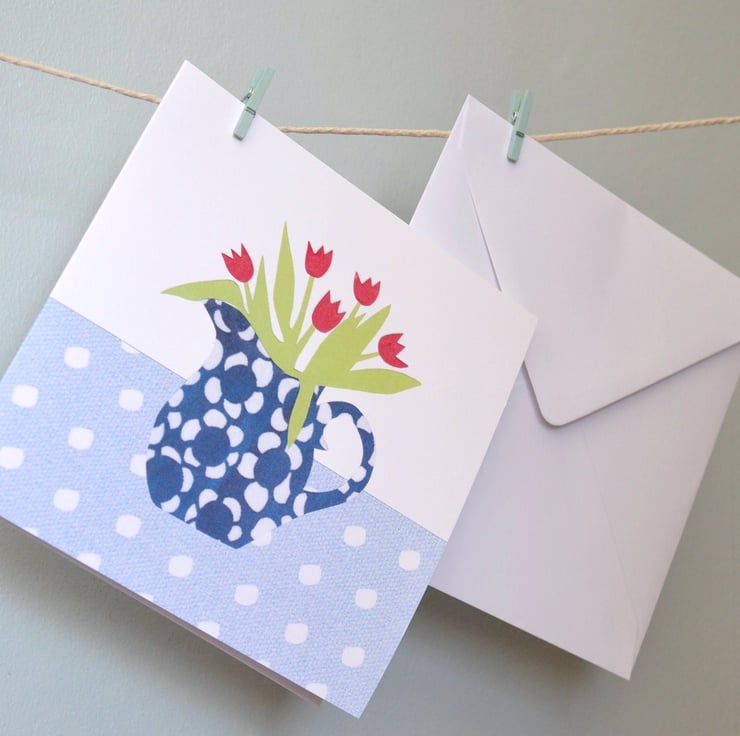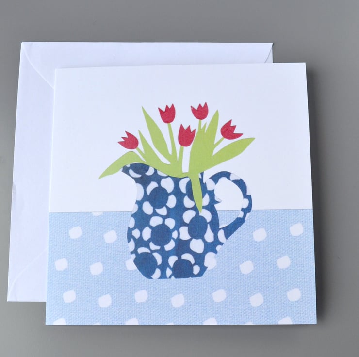 Cheery jug of red tulips in a blue and white patterned jug, on a blue and white spotty tablecloth. Original image all handcut from paper.