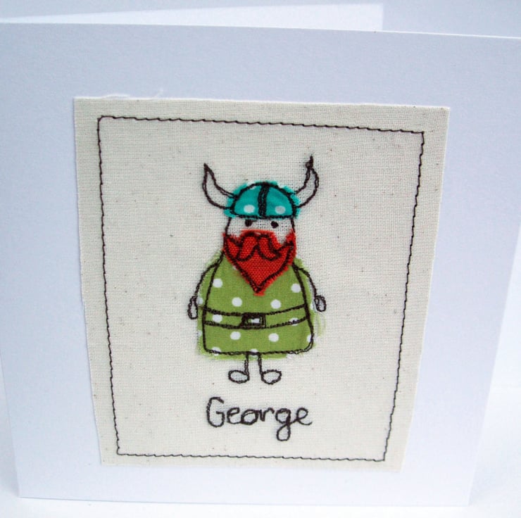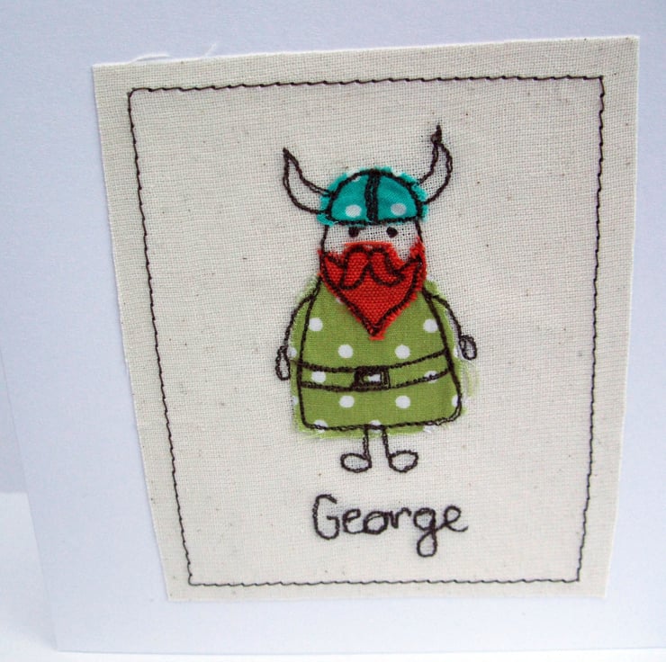 This rather sweet little viking has been machine embroidered using different fabrics to make the perfect card for any viking fan! Perfect for a child's birthday or a special occasion.