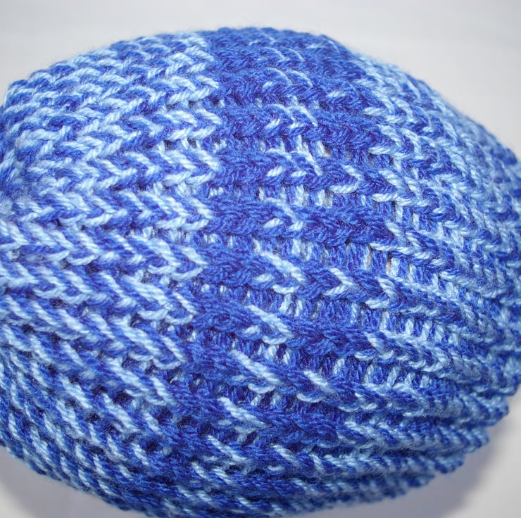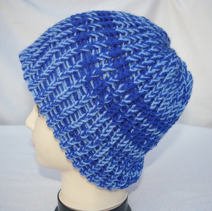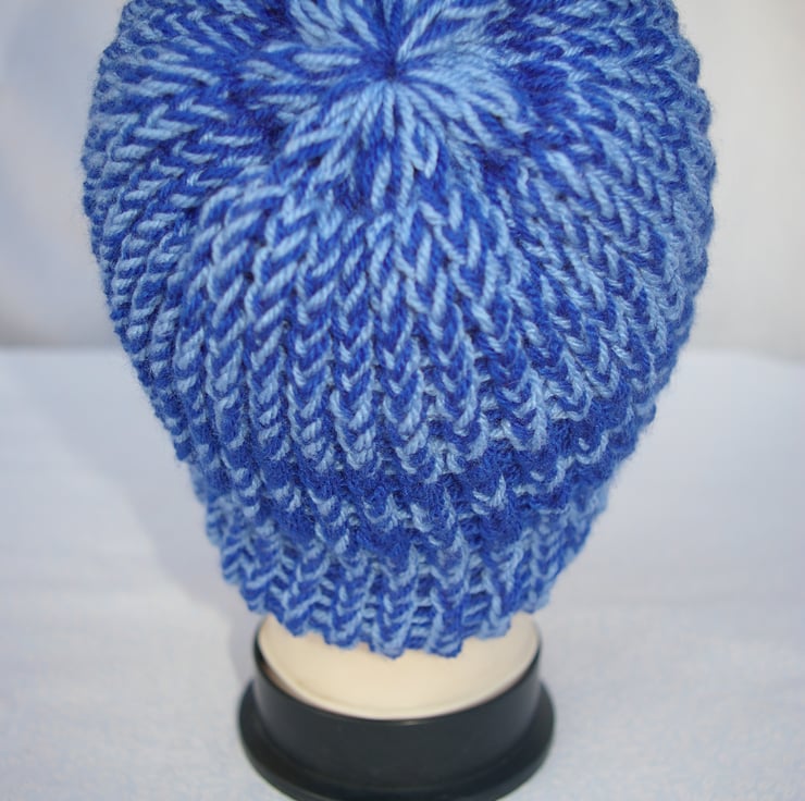 A large blue Beanie Hat knitted on a Hand Knitting Loom. This hat has been knitted in two shades of blue yarn, a royal or bright blue and a pale blue. Halfway up the hat are two bands of bright blue. The yarn used to knit this hat is a soft 100% acrylic yarn which has been knitted in two layers.