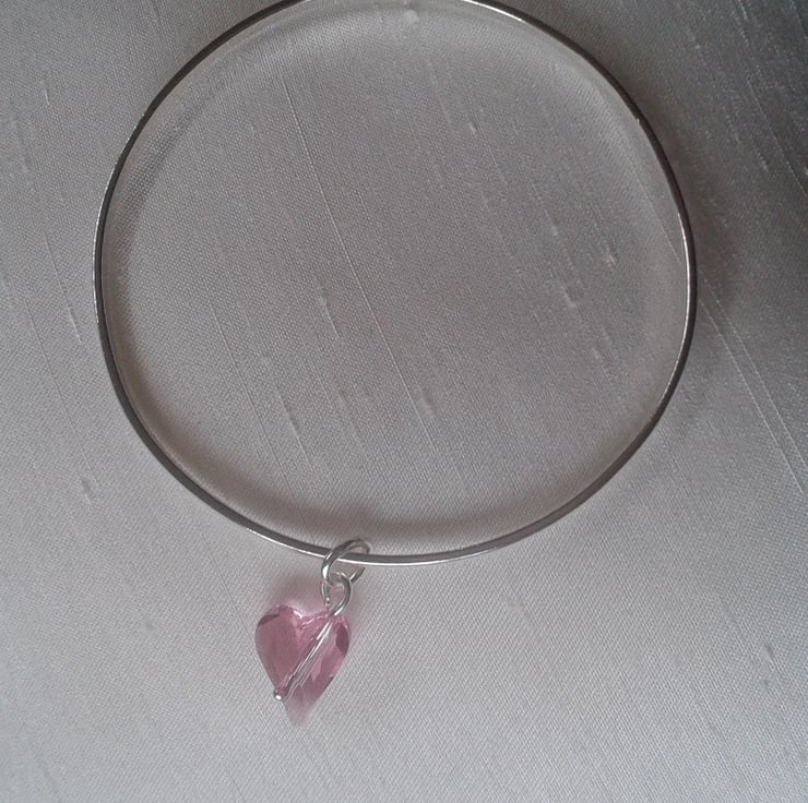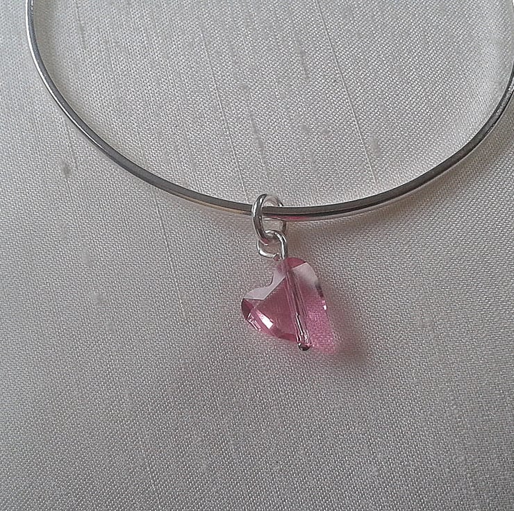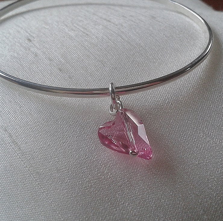 This beautiful bangle is a perfect gift for a romantic occasion! Made from D-shaped sterling silver wire, 2.3mm wide, it has been tumble-polished to a high shine. I have added a sparkling Swarovski crystal 'wild heart' charm in rose pink, attached by means of a sterling silver jump ring. Traditional silver hallmarks have been applied to the inside by the London Assay Office.