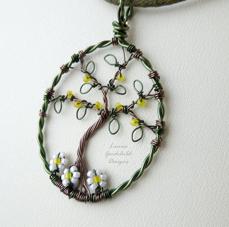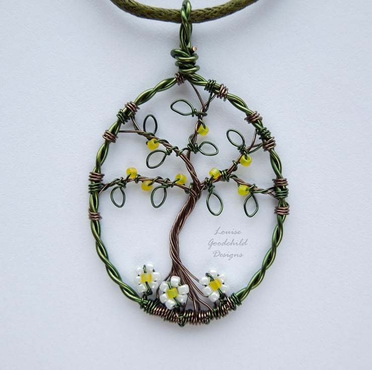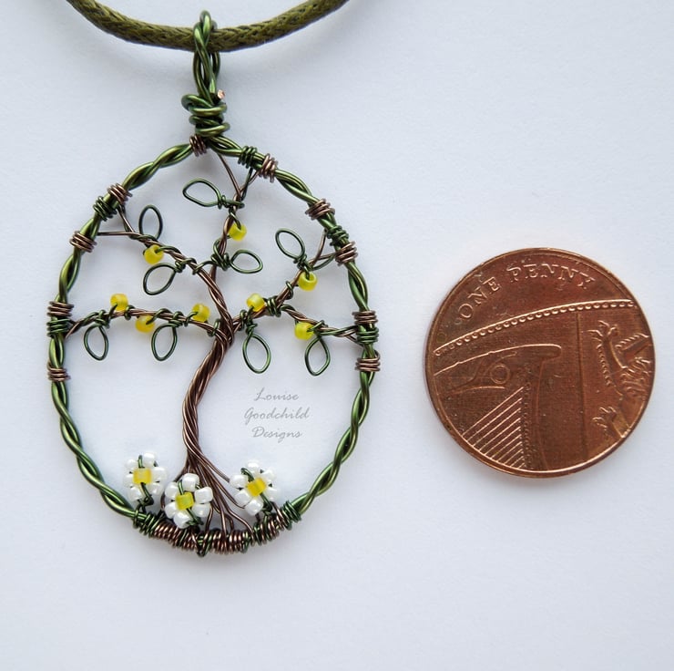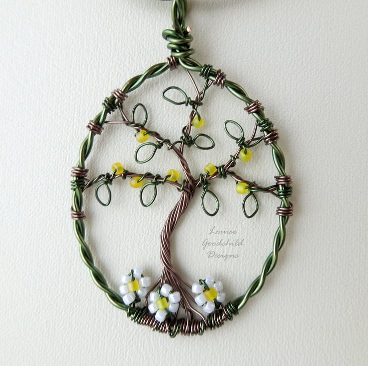 One of my smaller tree pendants, featuring the distinctive wire work style common in my larger pendants. Made entirely from high quality coloured copper wire, with glass seed beads, this one features a tree with yellow bead blossoms and daisies around the roots.