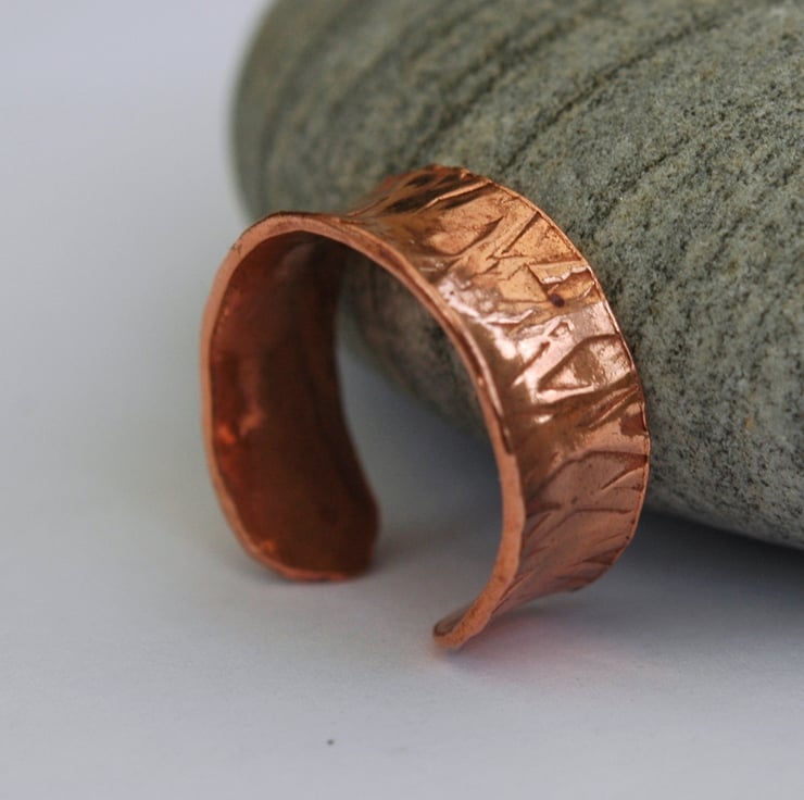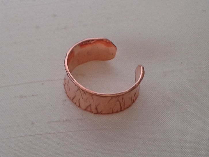 This lovely ring is one of a series I've made to try out some new texturing hammers. It ihas been hand cut from 1mm thick copper sheet and is approximately 7mm wide. It has been textured by striking it with a hammer that has a criss-cross surface and creates a pattern of diamond shapes. The top and bottom edges were then flared outwards giving it an anticlastic form. The ring weighs 2.8g and its size is approximately N, but as it is an open ring it can easily be adjusted to fit sizes in the range K-Q. It has been tumble-polished to a high shine. I can coat it with metal lacquer to reduce tarnishing or treat it with an oxidising agent to create a vintage-style patina if you prefer. Add a note to your order if you would like either of these options.