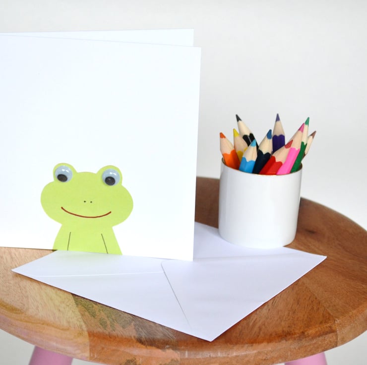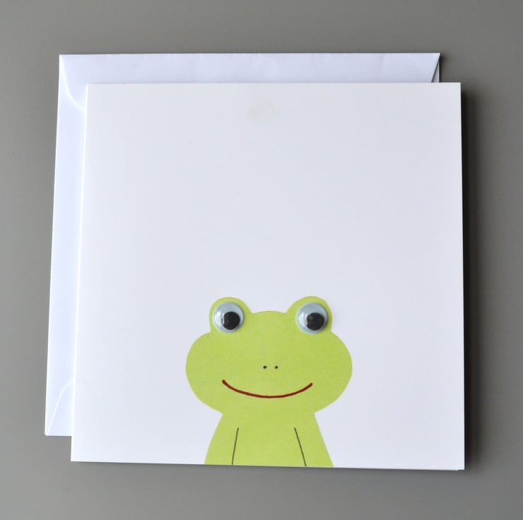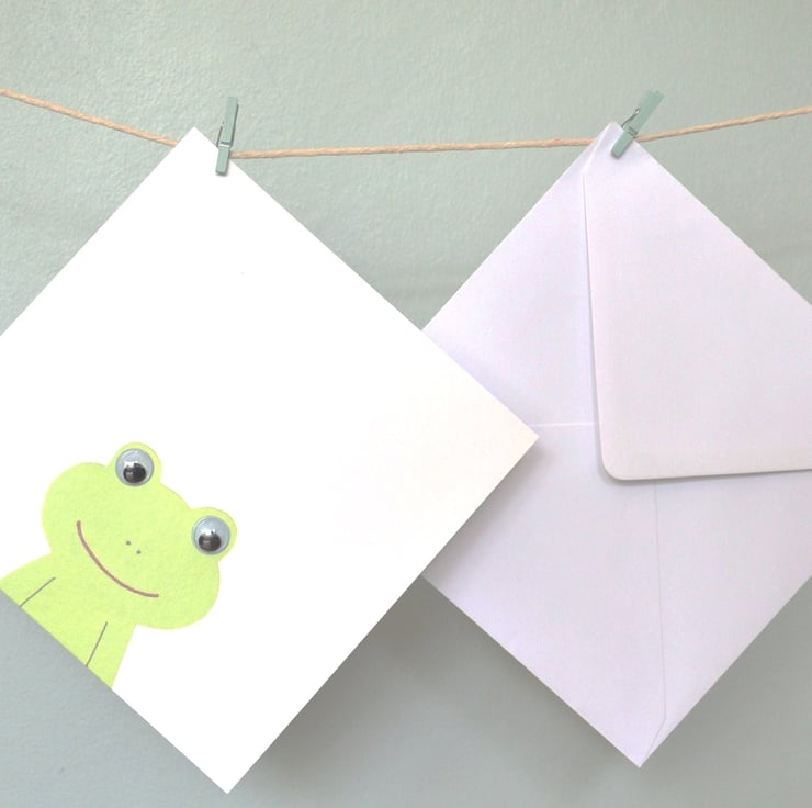 Cute green frog smiling at you from the bottom of this card, with hand-affixed googly eyes. Great birthday card for kids or the young at heart!