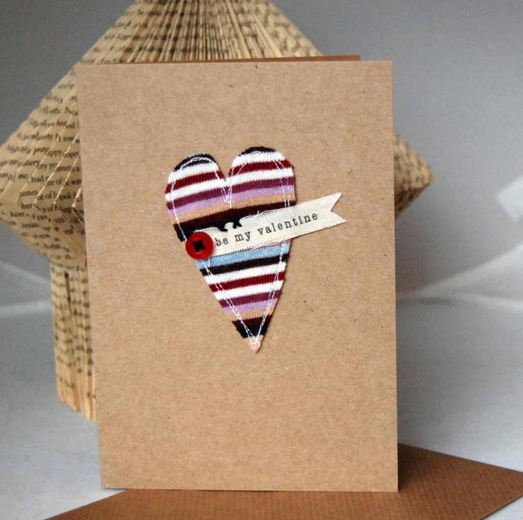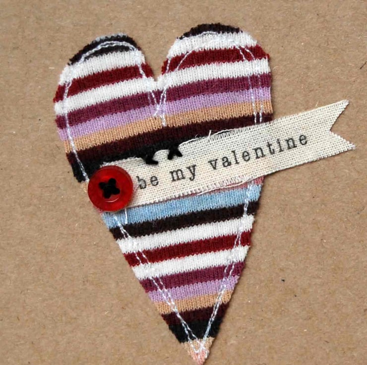 Stitched, recycled fabric heart with printed fabric sentiment and a little button embellishment on A6 Kraft card with envelope to match.