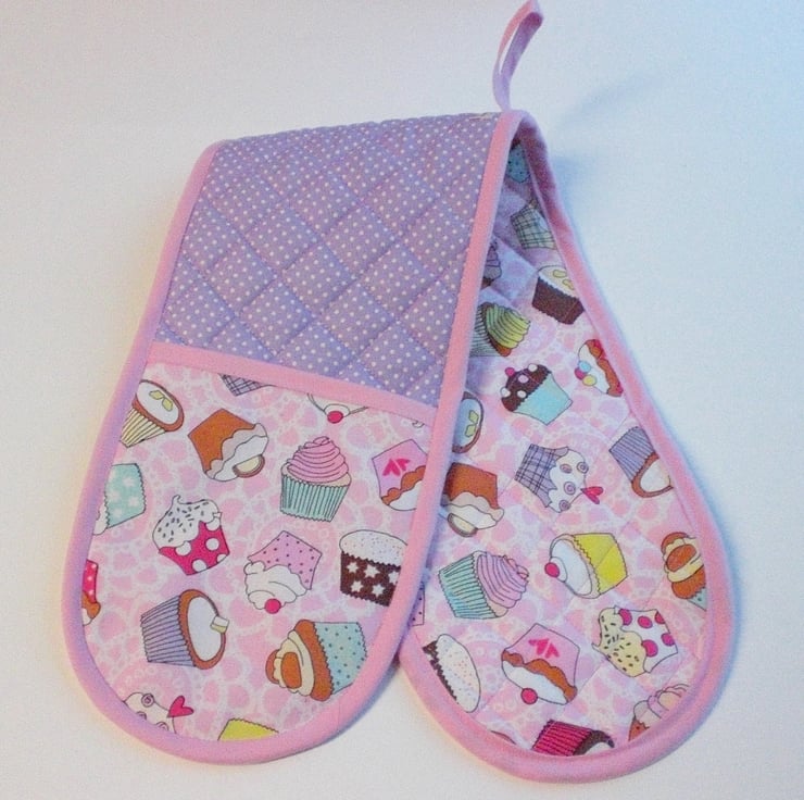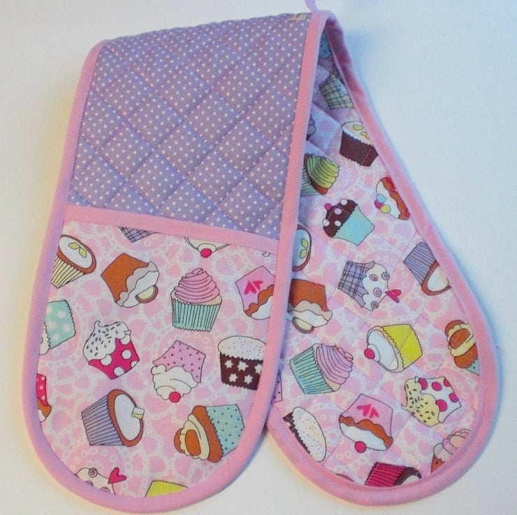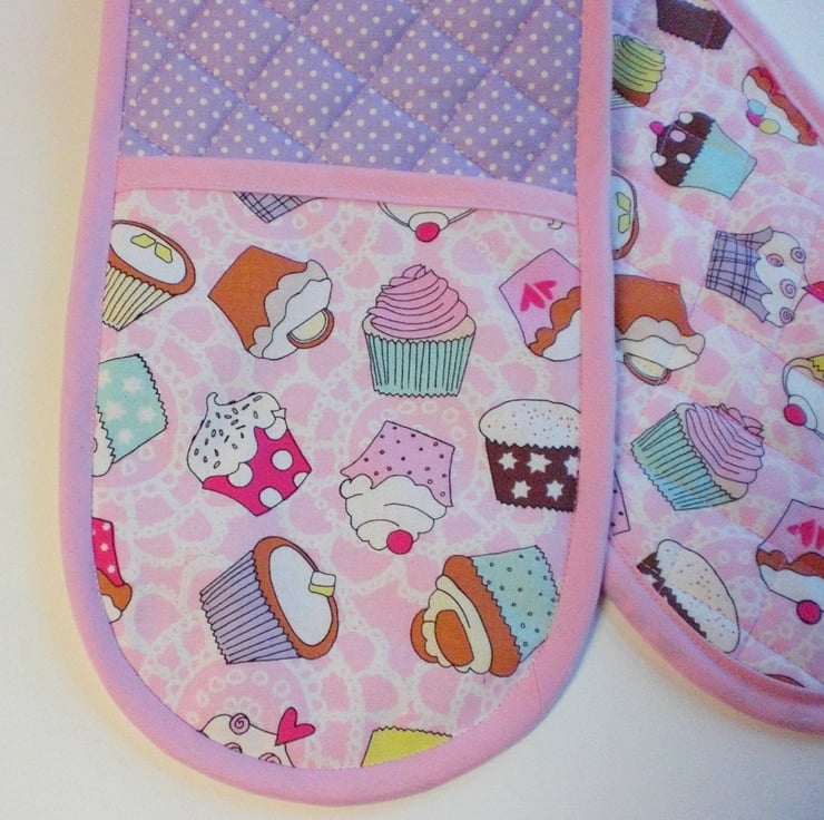 These oven gloves have been made using a lovely cup cake cotton fabric with a contrast dot fabric. There is a layer of insulating wadding(containing polyester), and a layer of cotton wadding inside, and the gloves have then been quilted.