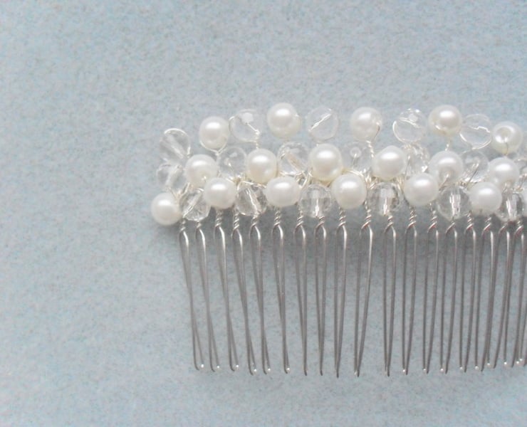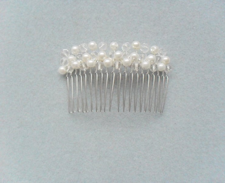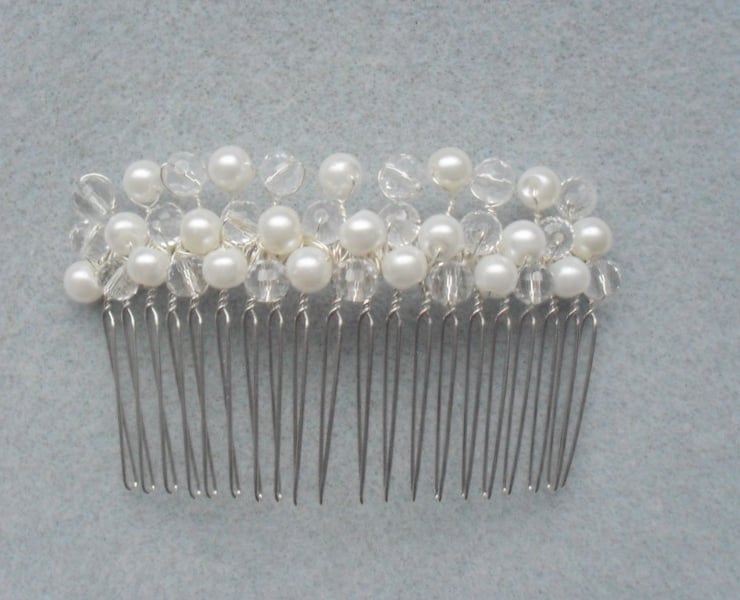 SALE was £9.50 now £5 Glass pearls and crystals are attached to a silver tone metal hair comb with silver coloured wire which has been coated to resist corrosion .