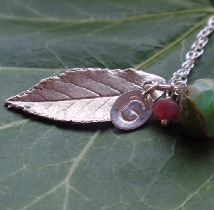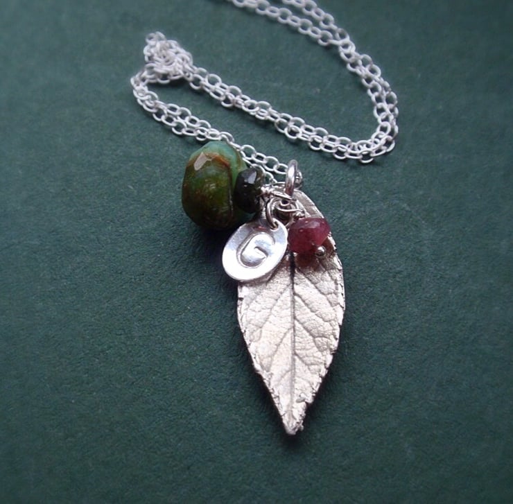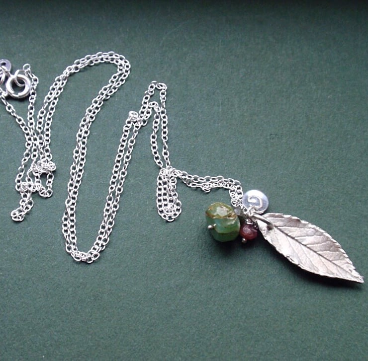 Sterling silver leaf necklace this beautiful cluster necklace has personalised with an initial (you can leave this out if you prefer unpersonalised) with a rustic green Peruvian opal (8mm) and a pink tourmaline rondelle (4mm). A pretty spring necklace, though can be worn any time of year!