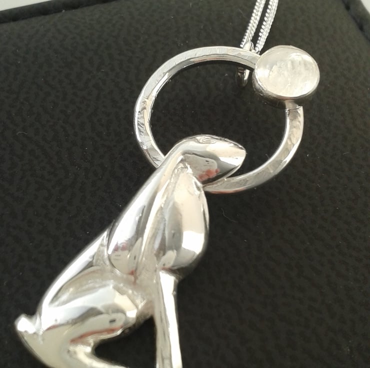 This gorgeous little sterling silver moon-gazing hare pendant is a limited edition production of one of my unique designs, with a halo and rainbow moonstone to set it off beautifully.