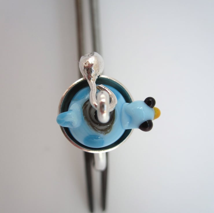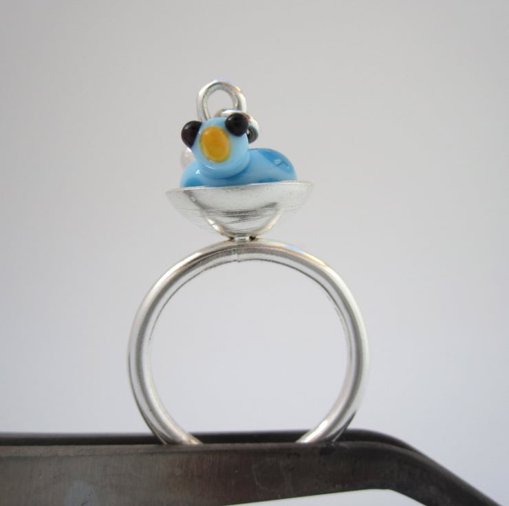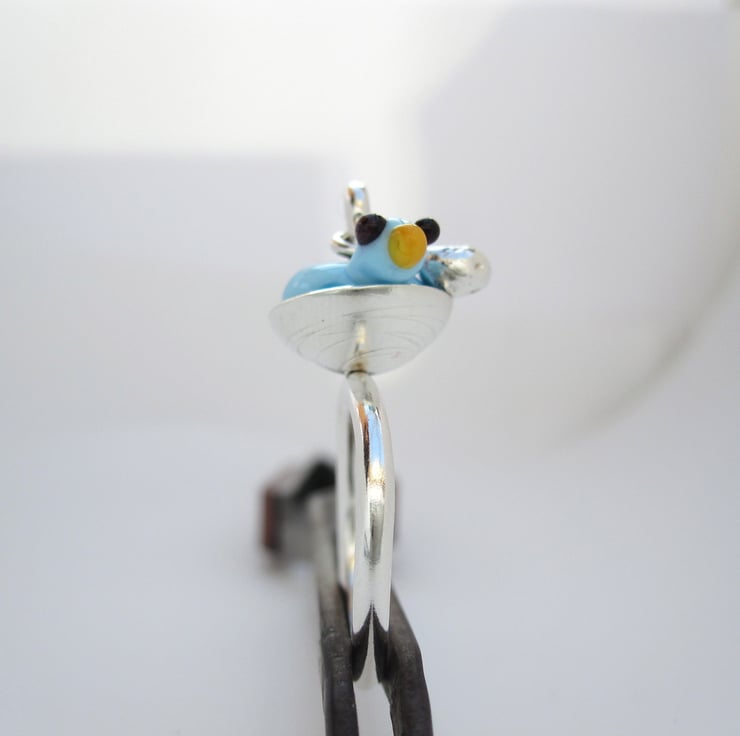 A unique, one-of-a-kind funny little bird ring. The effetre glass bird sits in a sterling silver nest and the little egg provides kinetic entertainment.