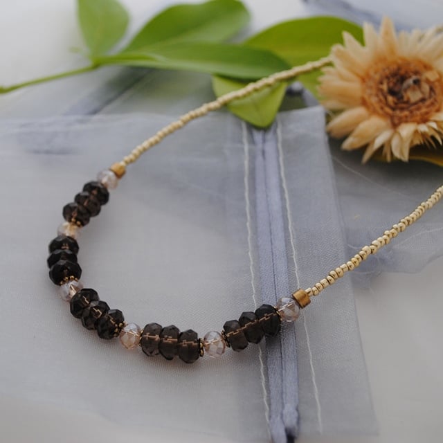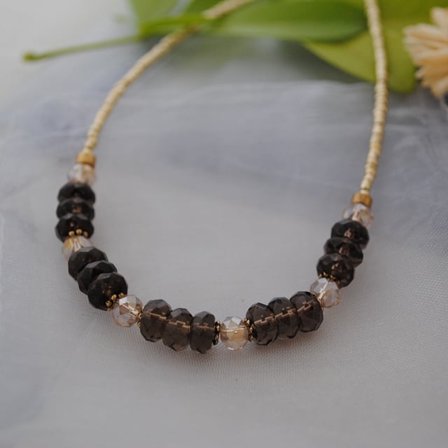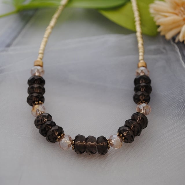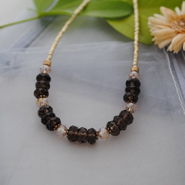 A unique necklace made with smoky quartz rondelle facetted beads, antique style champagne rondelle crystals, antique gold daisy spacers and gold heshi beads. The necklace is finished with soft gold coloured seed beads and fastened with a gold-plated lobster clasp.