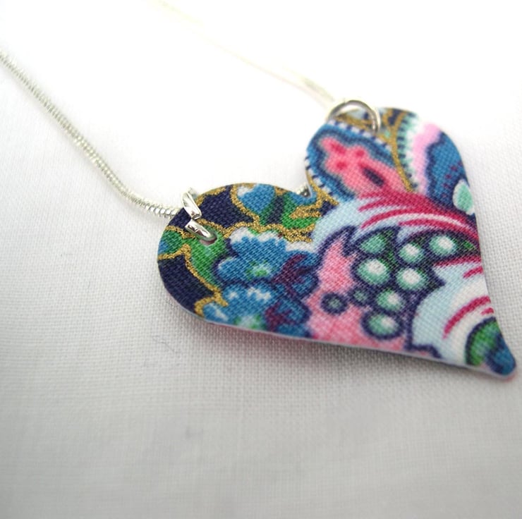 This beautiful and unique necklace has been created from offcuts of a cotton Paisley print fabric which has been hardened and cut to a heart shape and attached to a silver plated snake chain necklace with lobster clasp fastening.