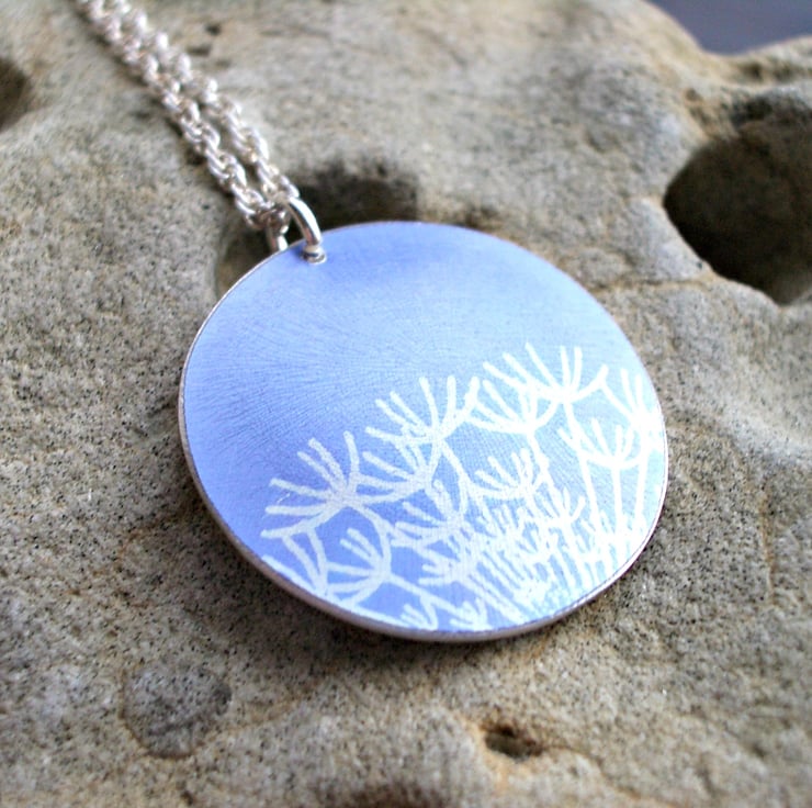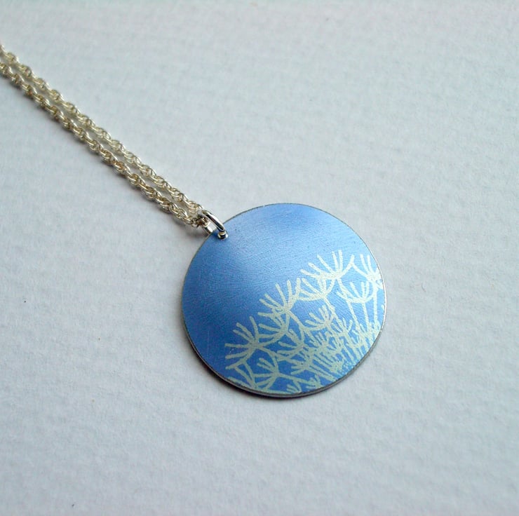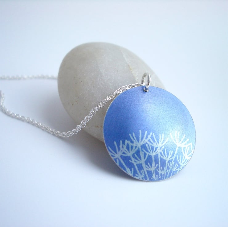 This simple pendant is hand made from aluminium which I have dyed a lovely chalky blue and printed with a pretty dandelion seed heads design. I saw pierce by hand the disc shape and dome it so that it catches the light.