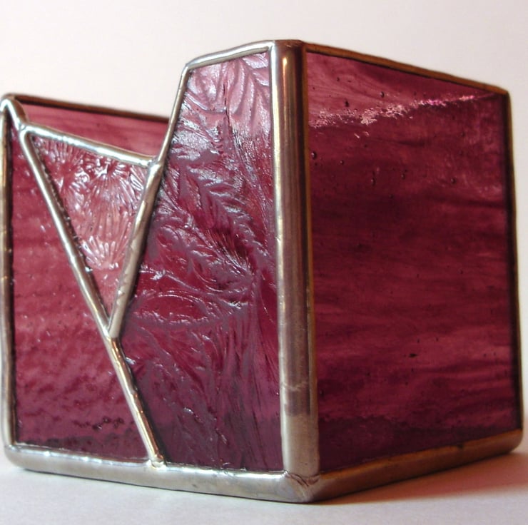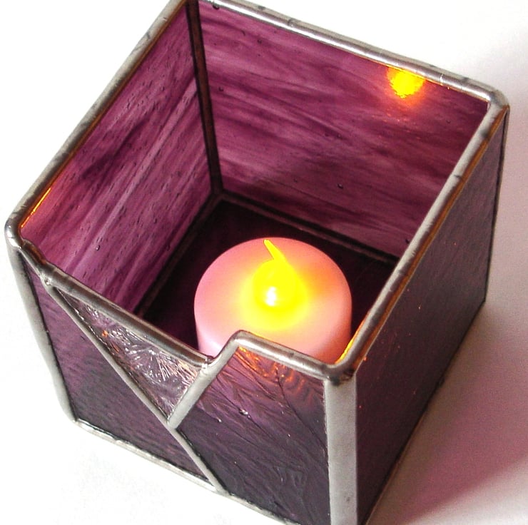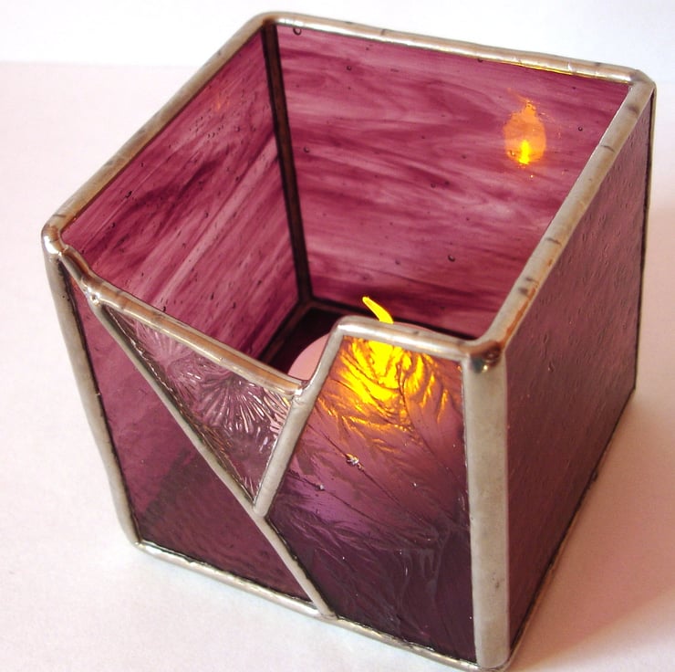 Stained Glass Tea Light Candle Holder, hand-crafted using the Tiffany method of glass making. Each piece of glass is cut by hand and the edges are wrapped in copper foil tape which I burnish to the glass. The pieces of glass are then soldered together and the finished piece is polished by hand. I have used a combination of pink glass in different textures. The main glass used is a pink Streaky glass complimented by pink glue chip glass, semi-hammered glass and a piece of clear textured Florentine glass.