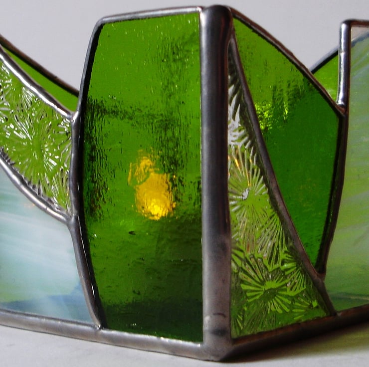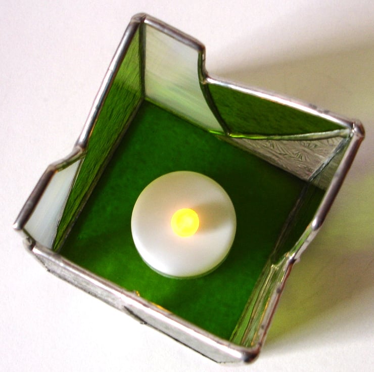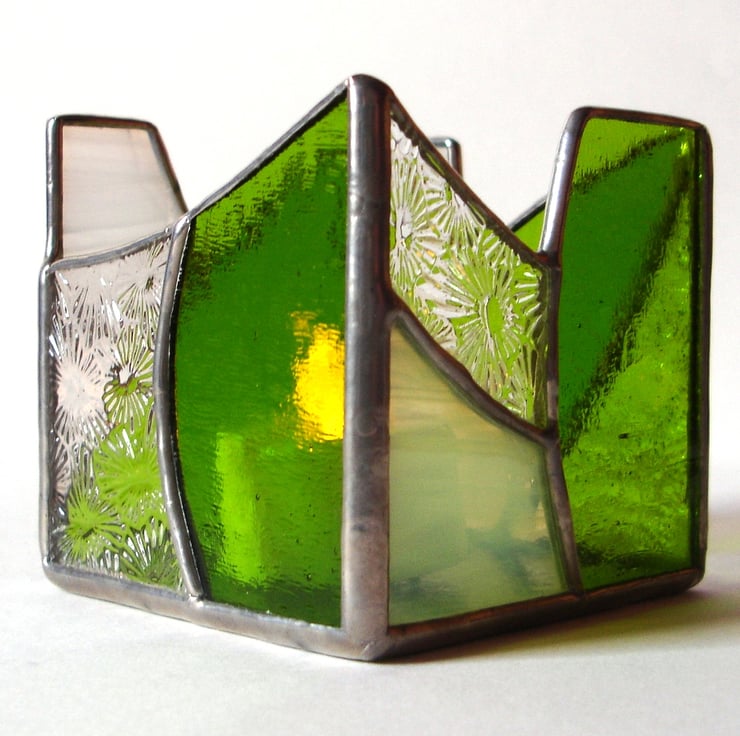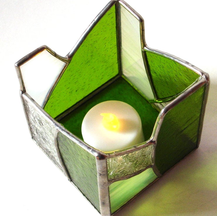 A unique Stained Glass Candle Holder for Tea-Lights, hand-made using the Tiffany method of glass making. Each piece of glass is individually cut and shaped. The edges of the glass are wrapped in copper foil tape which I burnish to the glass. The pieces are then soldered together and then hand polished. I have used Kokomo Restoration glass in a vibrant green, complimented by white streaky glass and clear textured Florentine glass.