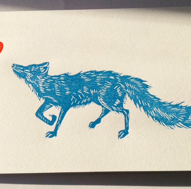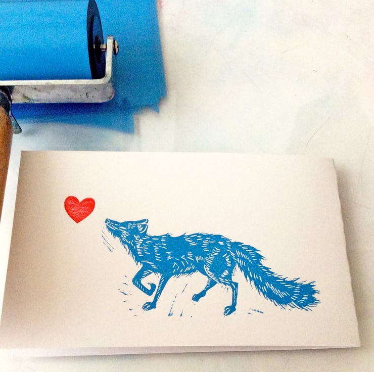 handmade lino printed Valentines card. A beautiful blue fox tilts its his head towards the heart in homage to love.