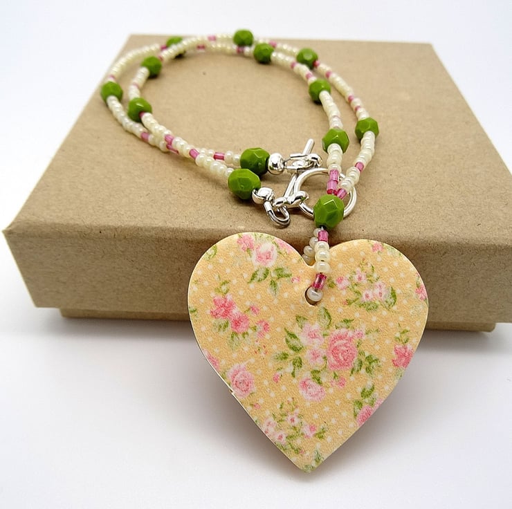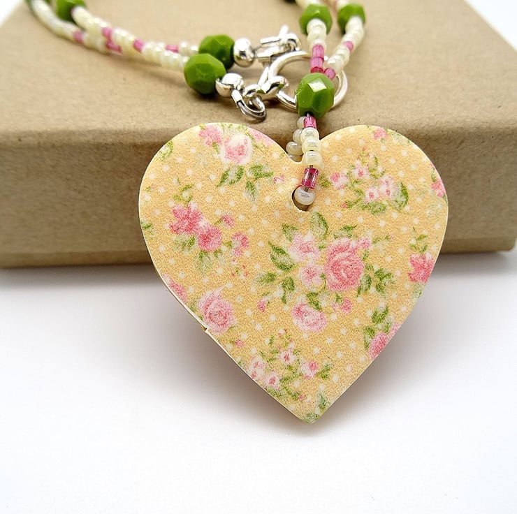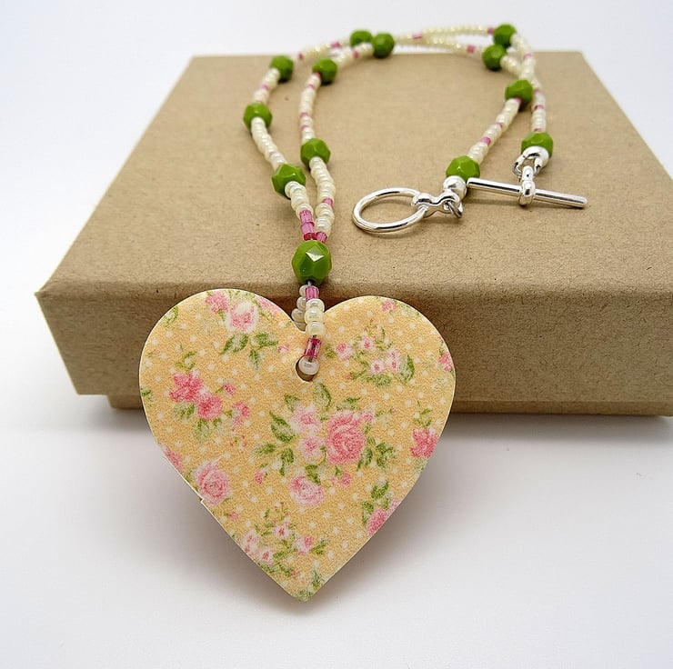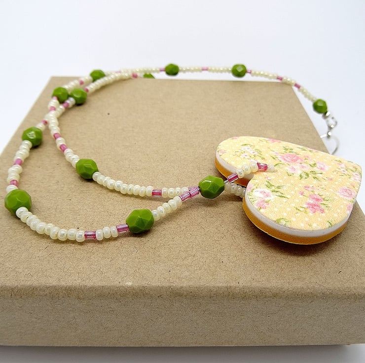 This is a lovely necklace made using a handmade 5 x 4cm polymer clay heart pendant. The pendant has a floral summer garden pattern. The necklace is finished with cream and pink seed beads and olive green czech glass faceted beads to complement the colours of the heart. The necklace measures 43cm (17") and is finished with a silver plated toggle clasp. As all of the items in my shop are individual pieces made by myself, this is the necklace you will receive. It will arrive gift wrapped in tissue paper and a organza bag.