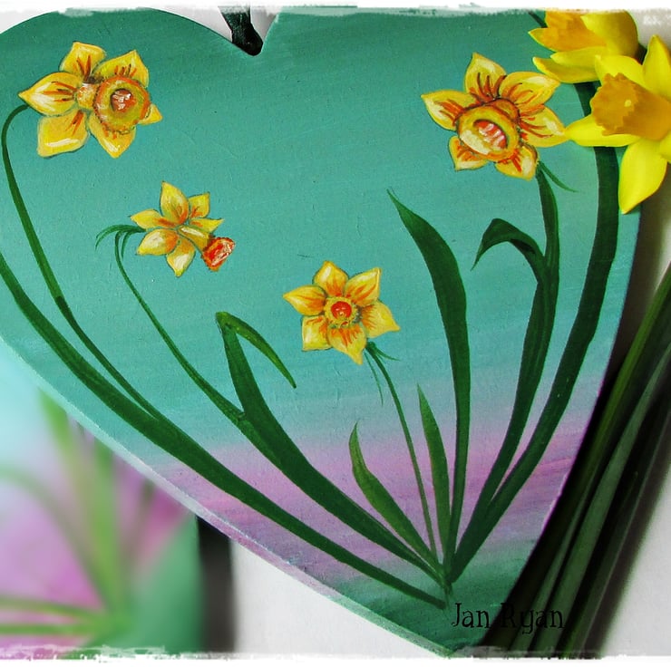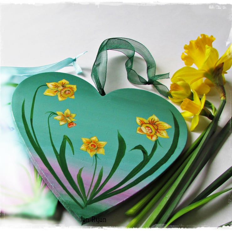 This large Heart is 15cm x 15cm (6 x 6inches) and hangs from a matching ribbon, the back is signed and painted plain green.