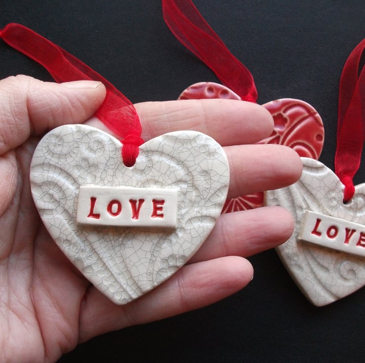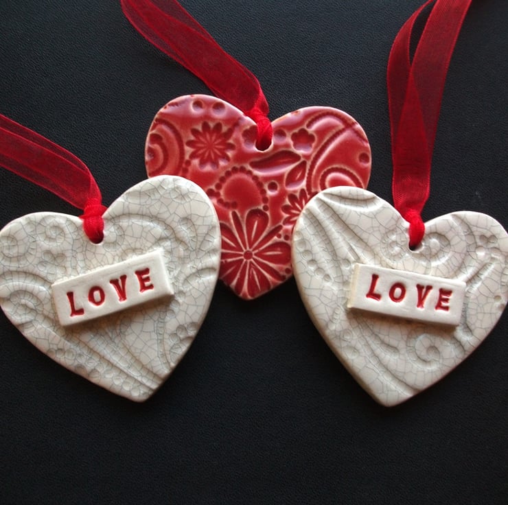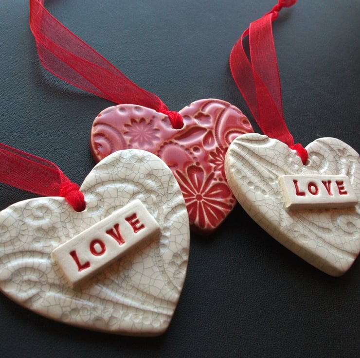 These ceramic hearts are made from white earthenware clay and decorated with the word Love. Two of them have a swirly background finished off with a crackle glaze for a shabby chic look and the other one is a shiny red glaze