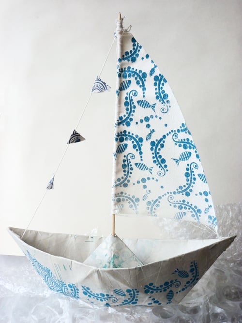 I have screen printed my wave and fishy design onto thick fabric cotton canvas and the body of the vessel too. Included are two wee sand bags ready for you to drop into the boat, this makes them sturdy and ready to be.