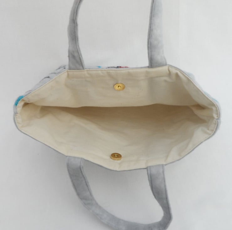 Ideal for everyday use or for that special occasion. This bag has been felted using a nuno felting technique. Grey merino wool has been felted onto a cotton muslin base. A variety of coloured threads, silk strands and dyed wensleydale curls have been added to the surface in a random pattern. A medium weight interfacing has been applied to the resulting fabric to add strength and stability and the bag has been lined with cream calico cotton fabric. All structural seams have been double stitched to give added strength. A magnetic clasp has been added to provide closure of the bag.