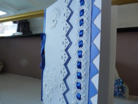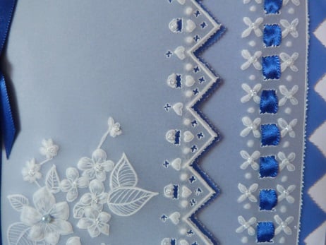A completely handmade individual card consisting of parchment which has been embossed cut and pierced into a design of flowers with geometric edging. Mounted onto blue vellum, there are four layers in all. Mounted onto quality pristine white card. The flowers have decorated with pale blue pearl beds. Highlit with fine silver glitter. Royal blue ribbon is threaded through on the right hand edge. Finished off with royal blue ribbon and bow.