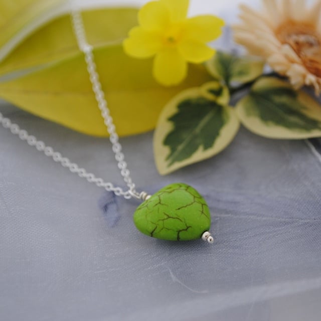 This pendant necklace is made with a 10mm howlite heart in apple green and a simple silver-plated chain. The silver chain is 45 cm / 18 inches in length and finished with a lobster or bolt clasp. The length can be altered on request.