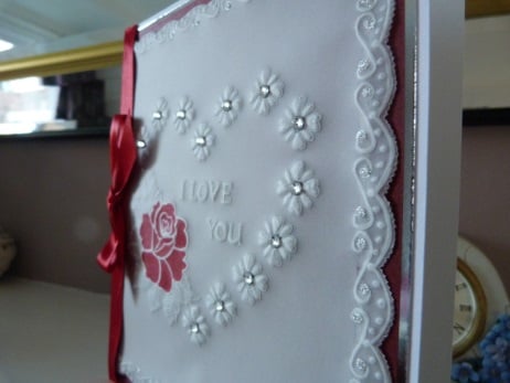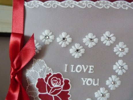 A truly special romantic completely hand made card. Consisting of a heart made from flower shapes with a beautiful rose to complete the heart, embossed and hand coloured onto parchment. A pretty scallop edges three sides. The centres of the hearts have crystal rhinestones and the scallop edging finished off with fine glitter. The centre of the hearts has the words I Love You embossed. Mounted onto dark red vellum, then onto silver mirri card and then onto quality pristine white card. Finished off with red satin ribbon and bow.