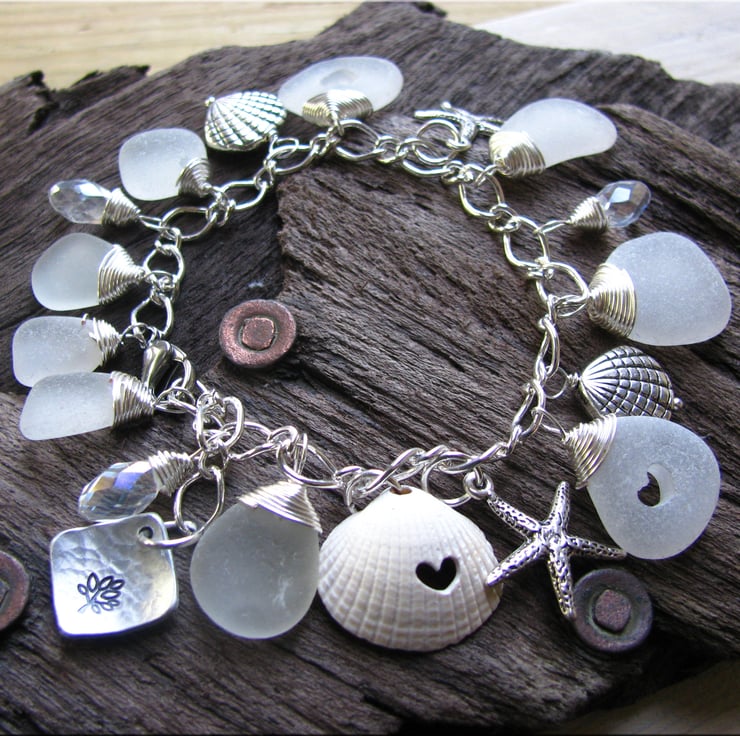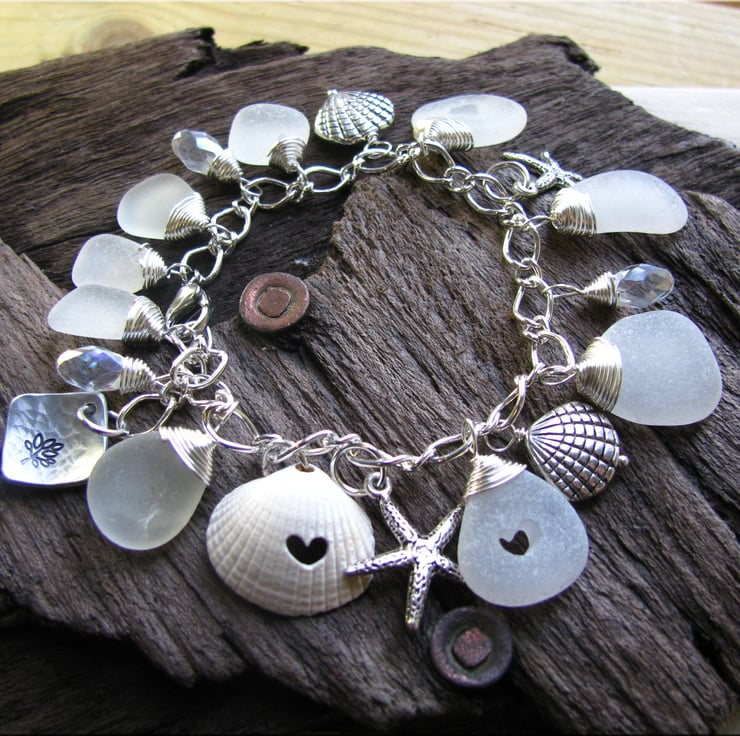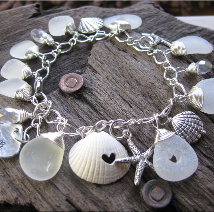 A charm bracelet made with gorgeous frosty white sea glass. Hand wrapped in silver plated non-tarnish wire, with starfish charms, shell charms and a little bit of sparkle from the faceted crystal beads. 3 carved out hearts nestle in this charm bracelet including a shell charm. Finished with a stainless steel lobster clasp. Adjustable length up to 8"