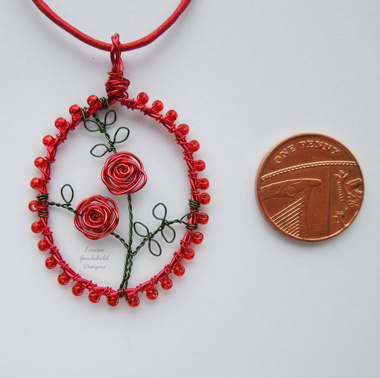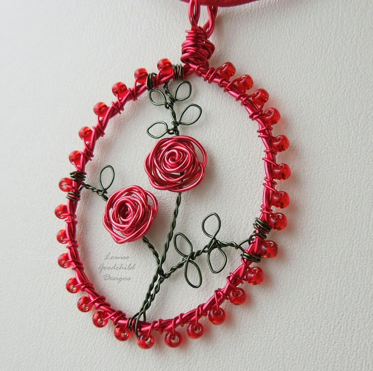 One of my smaller wire pendants, featuring a rose sprig with two roses and leaves. Made entirely from high quality coloured copper wire, with glass seed beads, this one features red roses with green leaves.