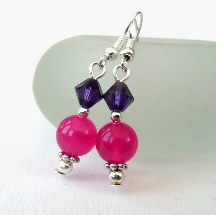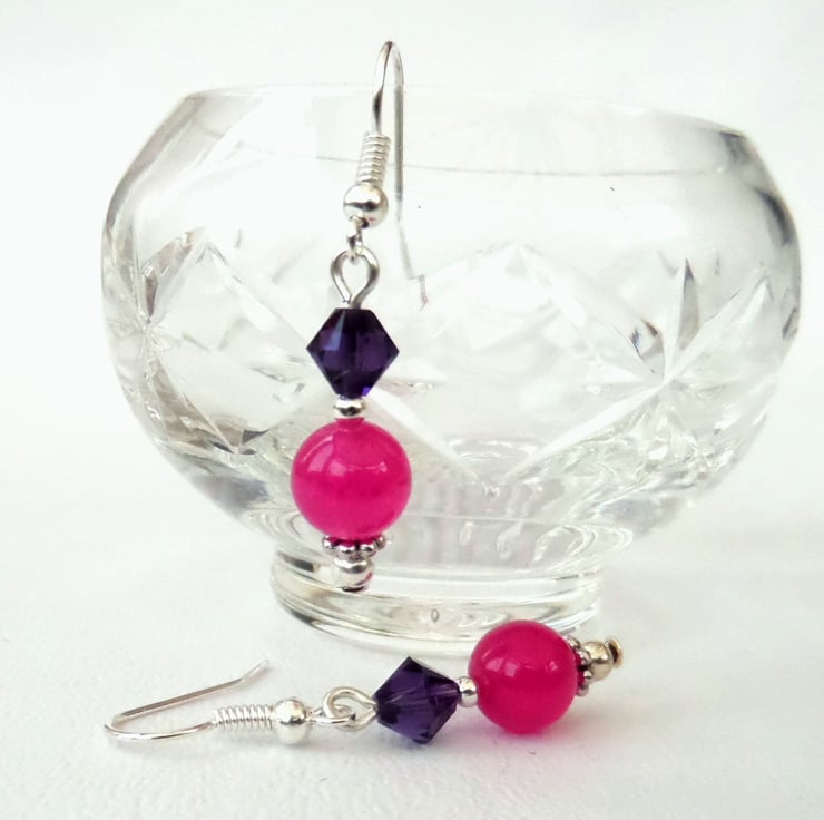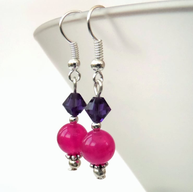 A pretty pair of handmade earrings, with rosy pink jade and purple velvet Swarovski® crystal. The pink is slightly deeper and a little less vivid that the photos show.