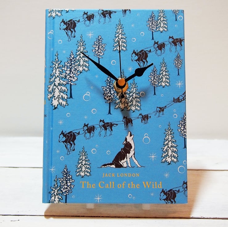 This stylish book clock is made by repurposing a hardback edition of The Call of The Wild by Jack London.