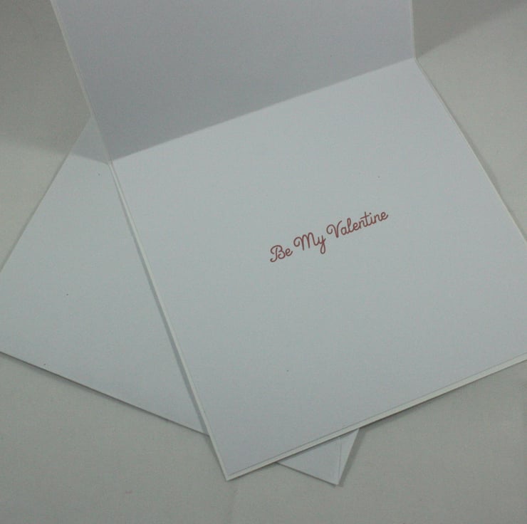 The card is approximately 12.5cm (5in) square. The message inside reads 'Be My Valentine'.