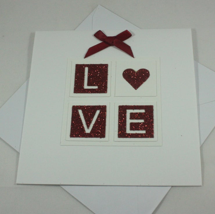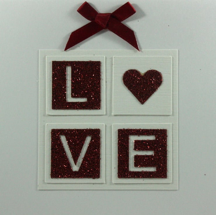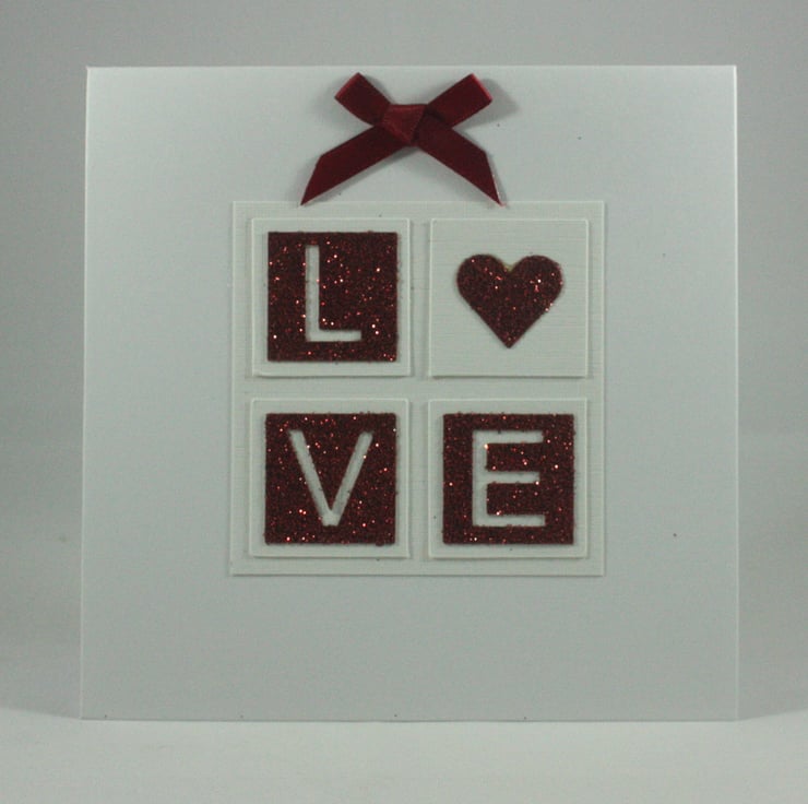 Square Valentine's Day card featuring the word 'love' cut from red glittered card and overlaid onto squares of white card and finished with a red ribbon embellishment.