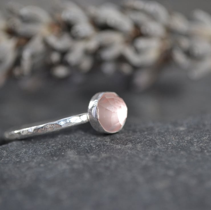 Rose quartz is said to signify love. This beautifully cut 6mm gemstone is set in sterling silver. The band is slim and textured (1.5mm). Perfect for stacking but beautiful and dainty on it's own.