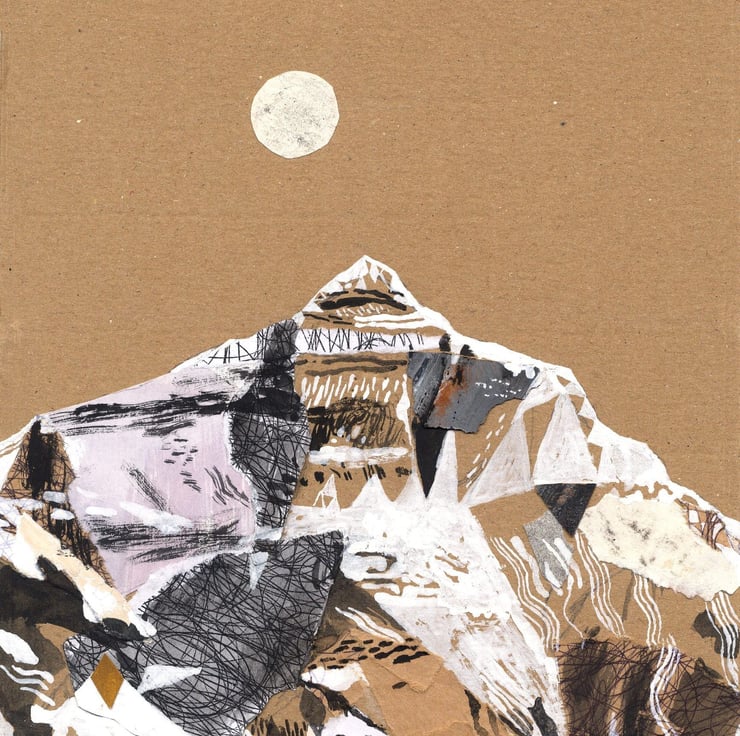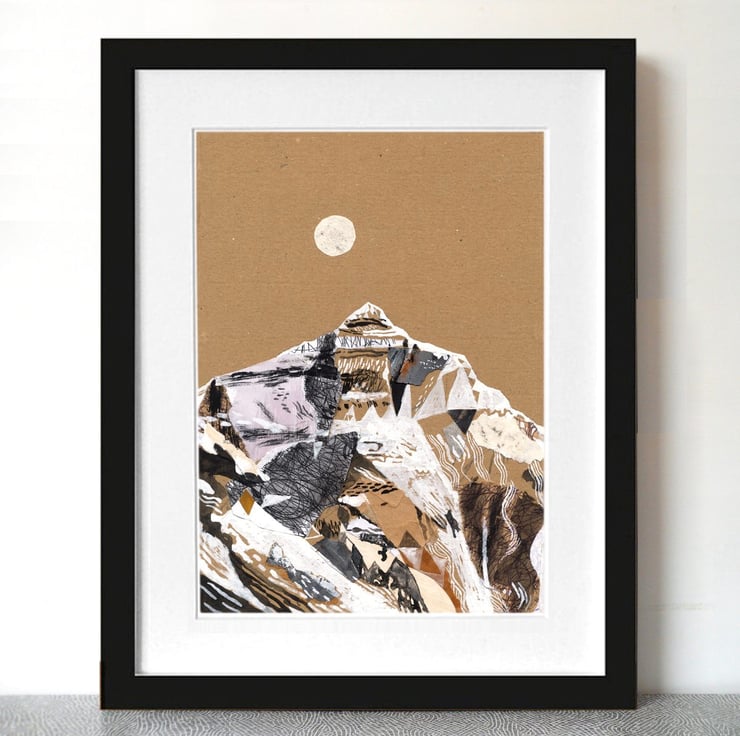 Here is an A3 Print (11.69 in x 16.54 in) of an original mixed media collage of Mount Everest, the highest mountain in the world, part of a series of 4 images of the highest mountains on earth