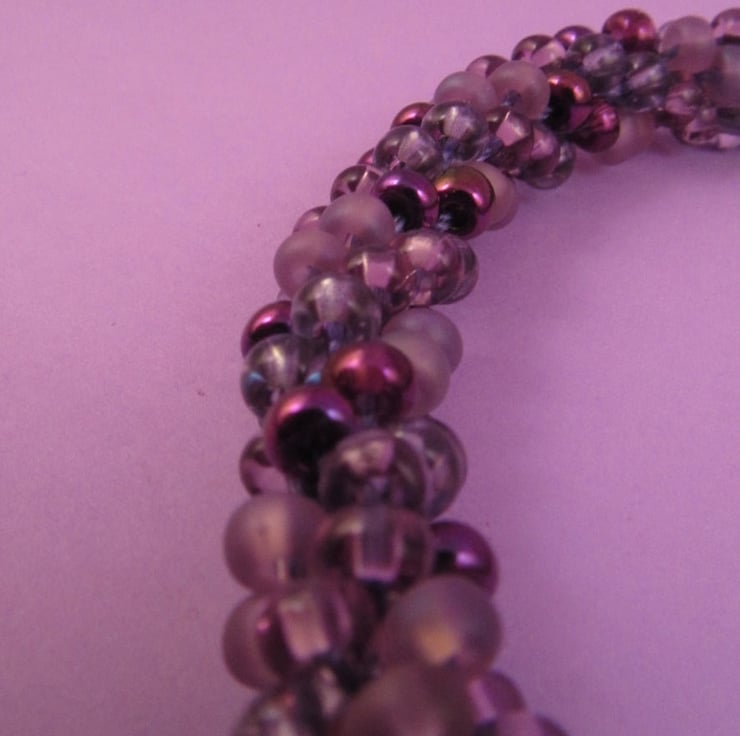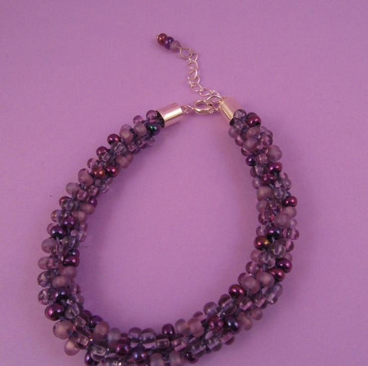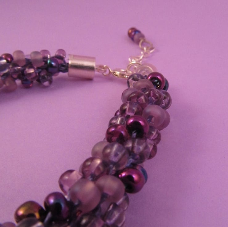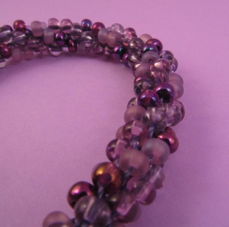 This is a beautiful purple beaded kumihimo bracelet. It is created with glass seed beads, S-lon purple cord, and silver plated copper. This bracelet would use lots of delicate shades of purple seed beads, some are really shiny and add sparkle to the piece.