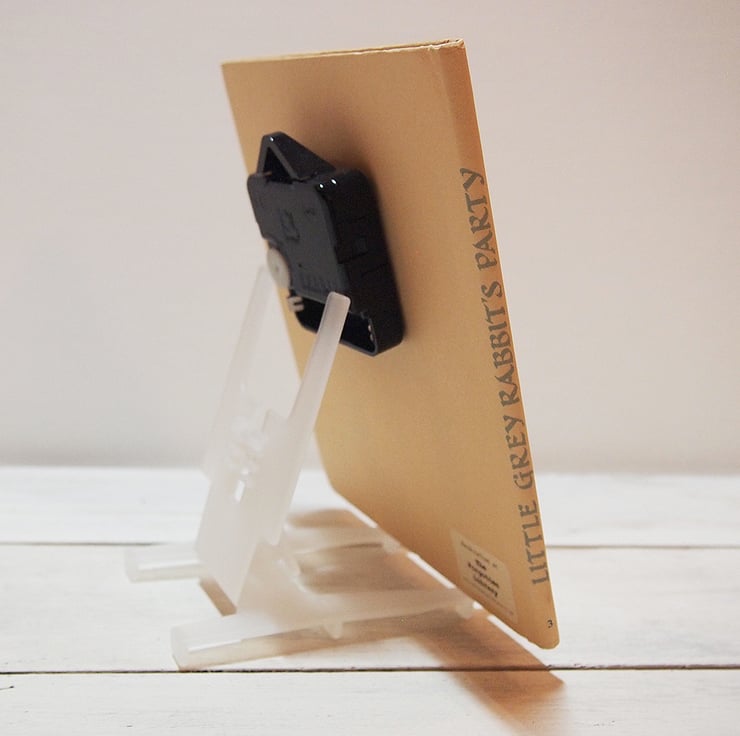 This book clock is made by repurposing a hardback copy of Little Grey Rabbit's Party by Alison Uttley from 1969.