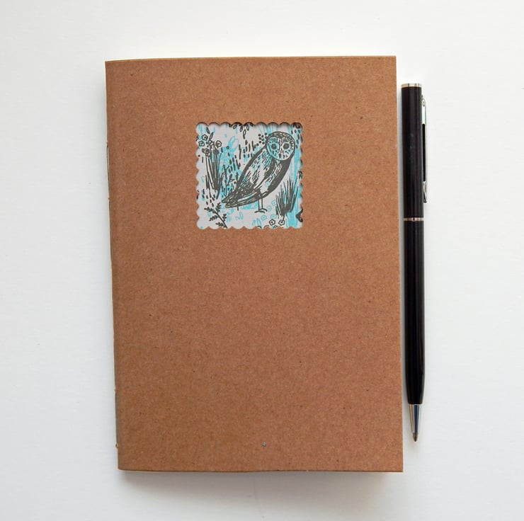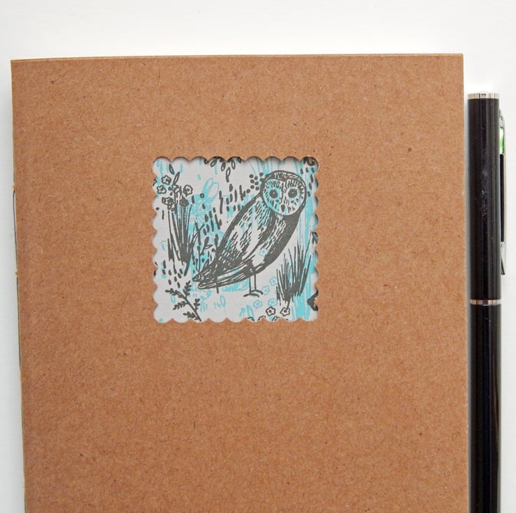 A handbound kraft-covered notebook, with an owl framed by a cut-out in the front cover.