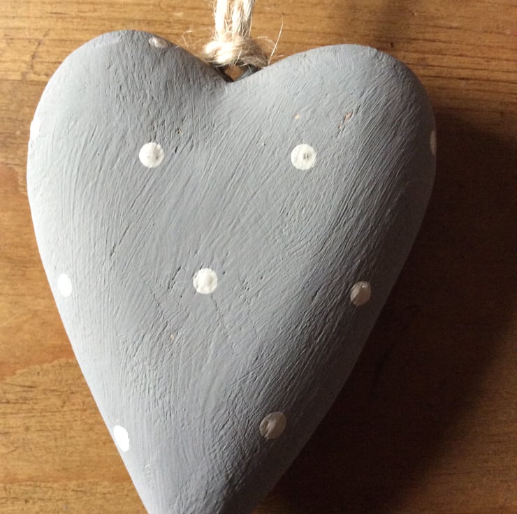 Wooden heart, painted in French Linen chalk paint, with cream dots, with jute hanging.