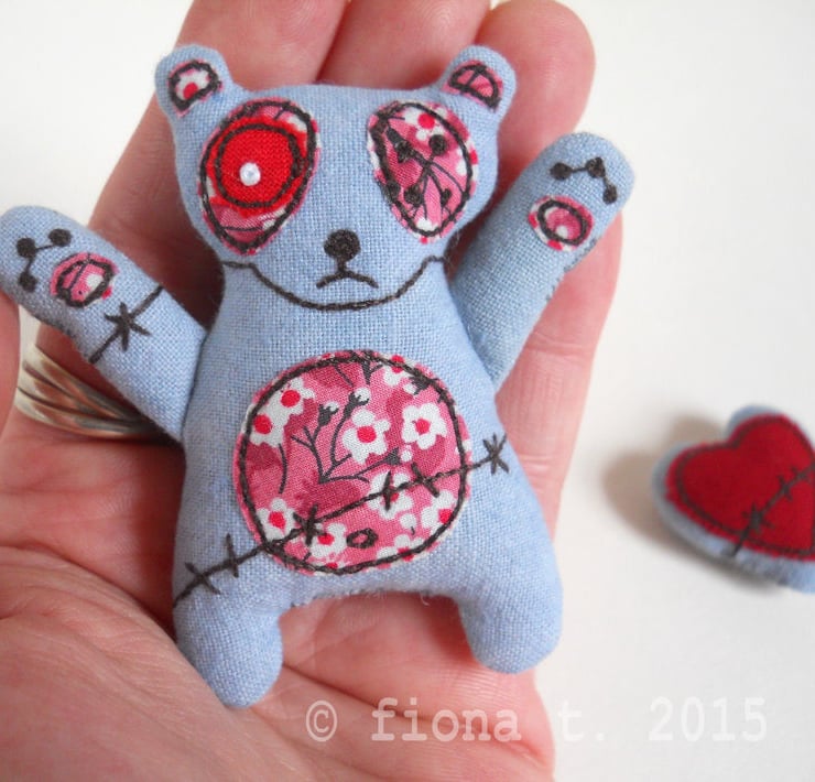 panda is made from pink floral liberty print cotton fabric which is layered & appliqued onto hand dyed grey cotton calico, and the intricate details are drawn freehand with free machine embroidery. panda’s one remaining eyeball is hand embroidered.