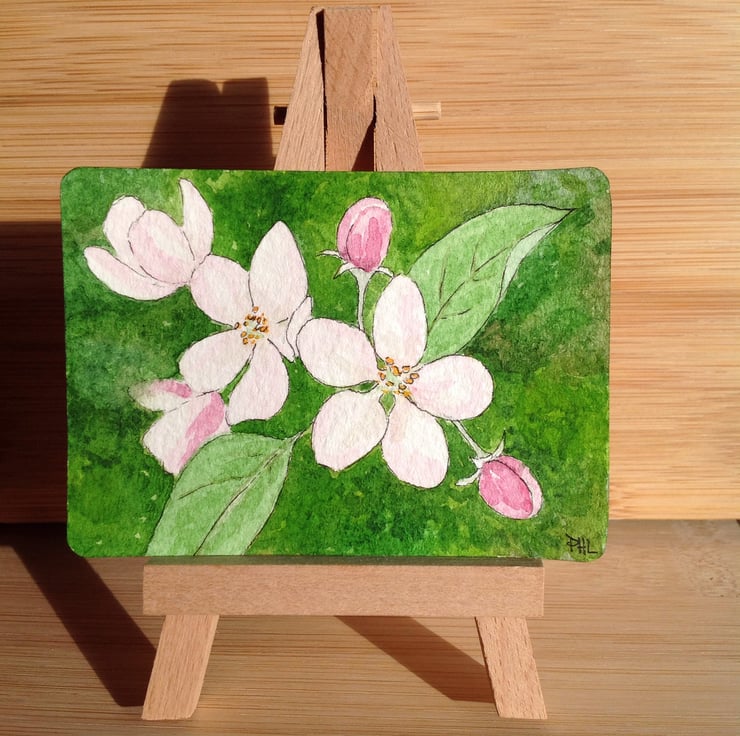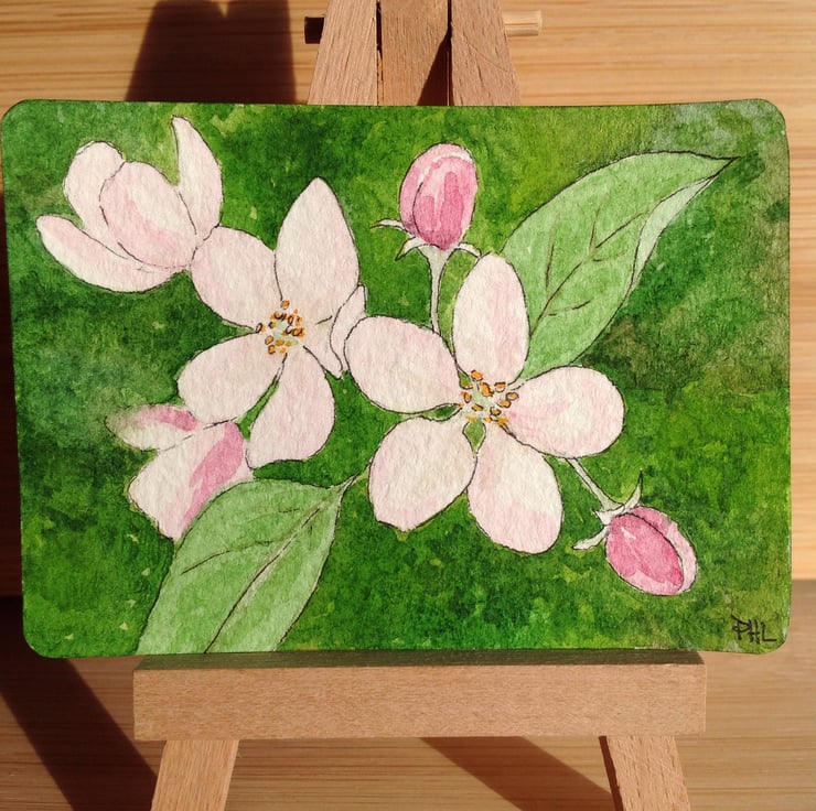 This ACEO is an original watercolour of Apple blossom measuring 2.5 x 3.5 inches (63 x 89 mm).