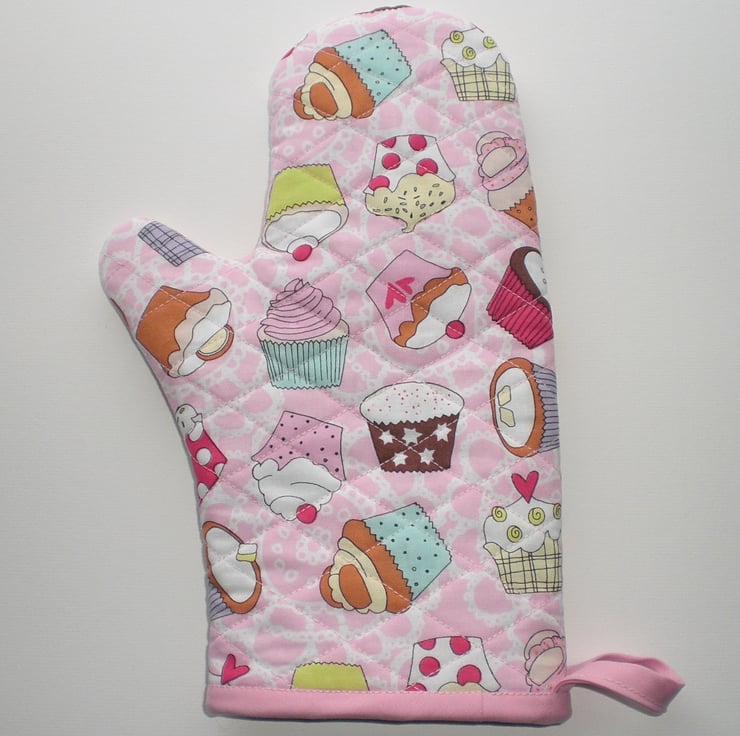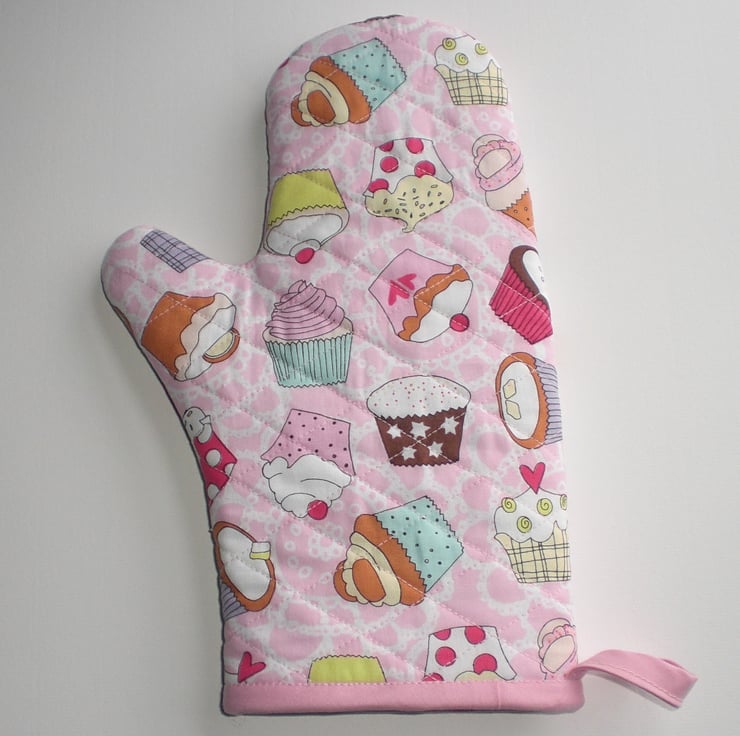 This oven glove has been made using a lovely cup cake cotton fabric .